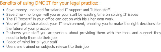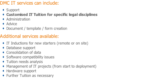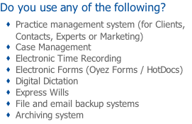 Solicitors We use RealVNC© to help customers remotely. Who manages your office documents and documentation? Office Procedures Manual  Style Guide Telephone directory Family tree Policy documents  Forms Accreditation documents System and office documentation Do you use any legal online services?  Lawtel Lexis Nexis  Law Society Online Library Electronic Immigration Network  HMRC SDLT Forms Online Sweet and Maxwell Westlaw TM Property Land Registry Direct Practical Law Company Do you have standardised correspondence templates? Letter Fax Invoice Compliment Slip Credit Note Attendance Note Telephone Attendance Note Memo